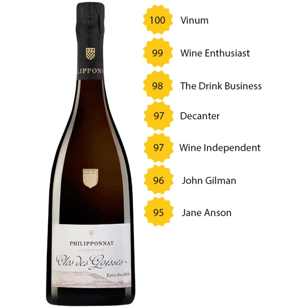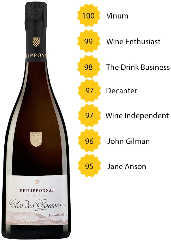 Decanter bewertete Clos des Goisses 2014 wie folgt: “ From the 5.83-hectare walled vineyard in a cooler, ‚classic‘ vintage for Champagner, giving this a finessed and charming expression. Baked pastry and soft lemon curd notes on the nose, smells inviting and softly floral – honeysuckle, jasmine, lemon and lime rind with some peach. Juicy and so zesty straight away, bright, mouthwateing, scintillatingly fresh and lively, thrilling even, with tiny persistent bubbles that instantly froth and fill the mouth. Alive and energetic with lemon rind and juice, succulent green apples and strawberries, grapefruit and ginger bitterness with touches of salinity and graphite dotting the finish. This makes you instantly want another glass, but this has structure too and such a long finish. No malolactic fermentation. Dosage 4.5g/l. Made by Charles Philipponnat and Thierry Garnier“ – 97 Punkte