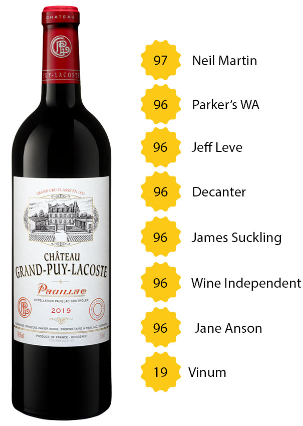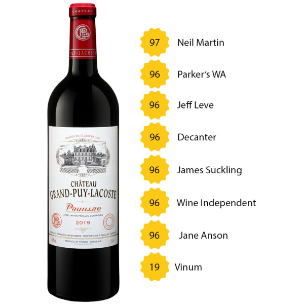 Vinum bewertete Château Grand Puy Lacoste 2019 wie folgt: „Umwerfende, subtile, blumige Aromatik; voller Ansatz, dichter, rassiger Bau, besondere Tiefe, extreme Rasse und ewige Länge, superbe Flasche, ein absolutes Muss und mit einer der besten Weine des Jahres.“. – 19/20