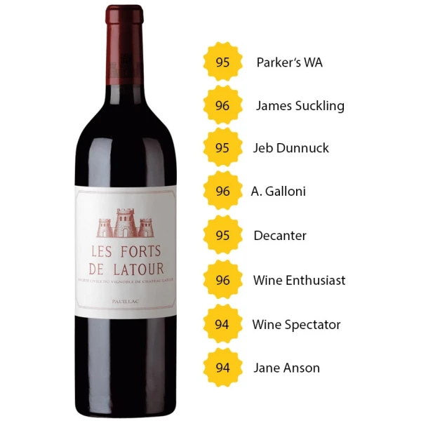 - Robert Parker’s Wine Advocate bewertete (03/2022) Les Forts de Latour 2015 wie folgt: „The 2016 Les Forts de Latour is superb, unwinding in the glass with notions of blackcurrants, wild berries, sweet loamy soil, cigar wrapper and English walnuts. Medium to full-bodied, deep and layered, it’s concentrated and tightly wound, with superb depth at the core, lively acids and ripe, powdery tannins. This is an impeccably balanced, utterly classical Forts de Latour worth a special effort to seek out..“ – 95 Punkte