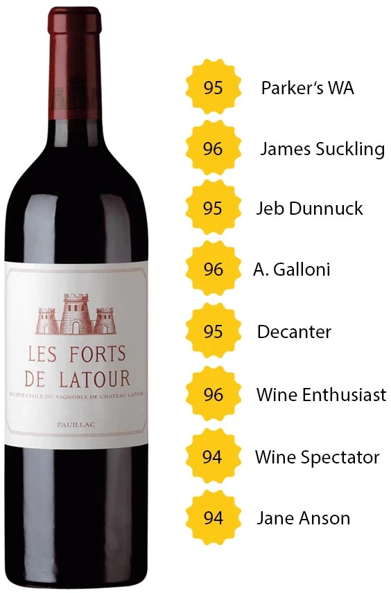 - Jeb Dunnuck bewertete (02/2019) Les Forts de Latour 2016 wie folgt: „The winner of the best second wine in the vintage goes to Château Latour. Their 2016 Les Forts de Latour is a match for just about anything out there. It shares its bigger siblings stature and class, with a sensational perfume of cedarwood, black currants, graphite, and lead pencil. Seamless, ultra-pure, and medium to full-bodied, it too needs a good 5-7 years of bottle age and will keep for 2-3 decades. “ – 96 Punkte