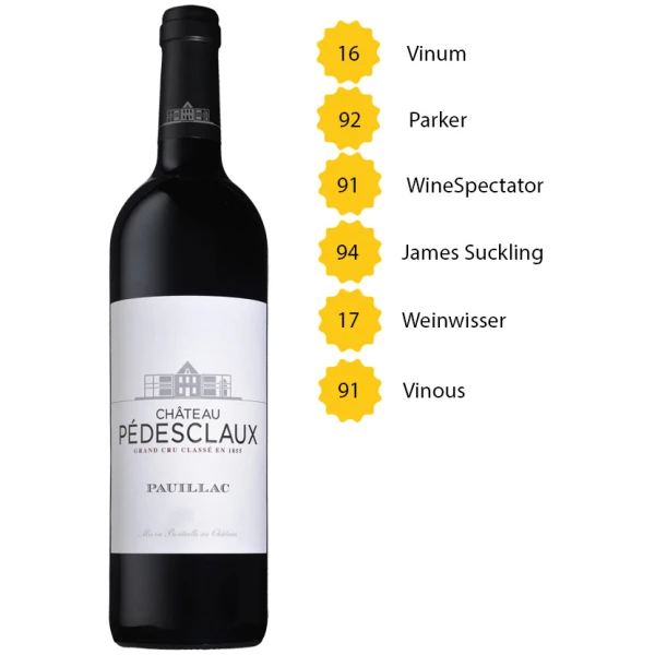 Robert Parker’s Wine Advocate bewertete Château Pedesclaux 2014 wie folgt: „The 2014 Pédesclaux has a tightly wound bouquet with redcurrant and crushed strawberry fruit, cedar and cigar box aromas filtering through with time. The palate is medium-bodied with firm tannin, plenty of black fruit laced with cedar and black pepper, though it does not quite deliver the complexity that I think the 2015 will on the finish. Still, it is a very capable vintage from the rejuvenated château that is certainly going places in the same way that Pontet-Canet did in the 1990s“ – 92 Punkte