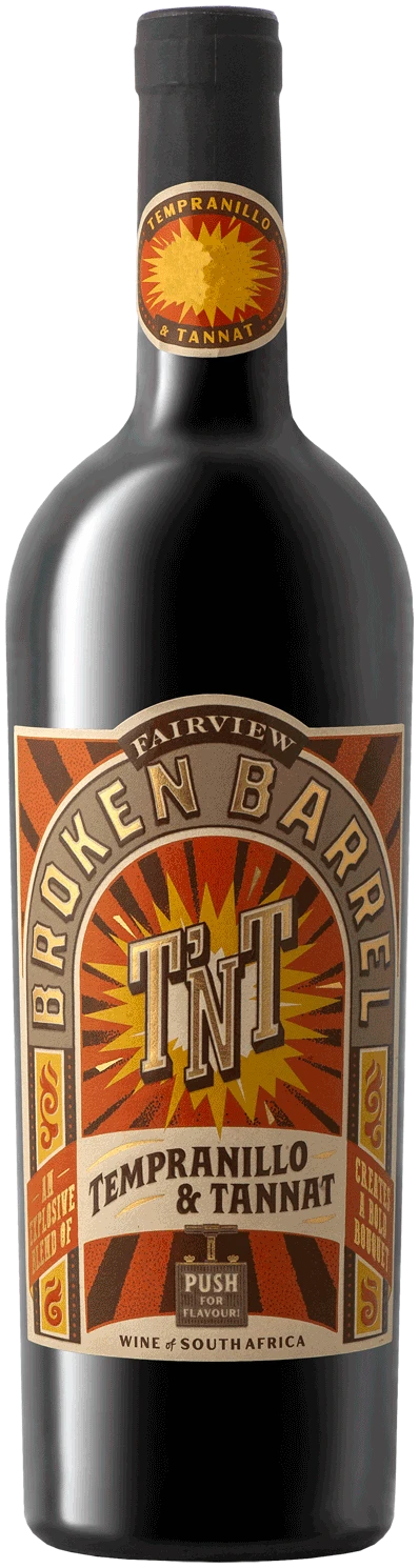 Der Fairview Broken Barrel ist ein einzigartiger Rotwein – das trifft auch auf die neueste Kreation, den Fairview Broken Barrel TnT, zu: Die Rebsorten Tempranillo (69%), Tannat (23%) und ein wenig Petite Sirah (8%) sorgen für eine Explosion an Aromen, denn Tempranillo und Tannat sind bekannt für ihre dunklen Fruchtnoten und gute Struktur bekannt. Das Cuvée beeindruckt sowohl mit seiner dunklen rubinroten Farbe als auch mit seinem Aromenfeuerwerk. Noten von reifen Pflaumen, schwarzen Johannisbeeren und warmen Gewürzen wie Zimt und Kardamom entfalten sich ausdrucksstark im Bouquet. Am Gaumen werden die dunklen Fruchtnuancen von Lakritz und einer spürbaren Tanninstruktur begleitet. Der vollmundige Fairview Broken Barrel TnT reifte achtzehn Monate in Eiche und lässt sich ganz fantastisch zu Wild, Pikantem oder Gegrilltem kombinieren.