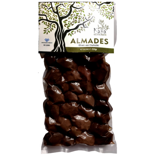 Die Kapa Oliven, werden lediglich mit natürlichem, gereinigtem Meersalz und etwas Zitronensäure behandelt. Almades bedeutet am Zweig gereift. Diese große einheimische Olivensorte aus Chalkidiki (Chalkidiki Olive) ist in der Welt berühmt für ihre saftige Fruchtigkeit und wird von besten Kennern und Gastronomen als feinste Tafelolive verehrt. Olynthos und Oliven: Olynthos ist ein antiker nordgriechischer Ort, der sich in den grünen Tälern auf der Chalkidiki Halbinsel Kassandra am Golf von Torini erstreckt. Das Gebiet wurde bereits in der Jungsteinzeit (5.300 bis 4.500 v. Chr.) besiedelt. Der Name stammt gem. Überlieferungen vom Sohn des mystischen Gottes der Flüsse Strymon. Archäologische Funde deuten darauf hin, dass der Olivenanbau und diese Produktionsmethode hier bereits seit mehreren Jahrtausenden praktiziert wird. Das einzigartige Klima dieser Region und die schmackhafte großartige Almades Olivensorte sind wie füreinander geschaffen. Inhalt: Oliven in etwas extra nativen Olivenöl und gereinigtes Meersalz und Zitronensäure. Werte / Technische Daten: Siehe Bild Mindestens haltbar bis 10.0.2026 Verpackung: Vaccuumbeutel verschweißt 250 g Verzehrfertig ohne weitere Verarbeitung.