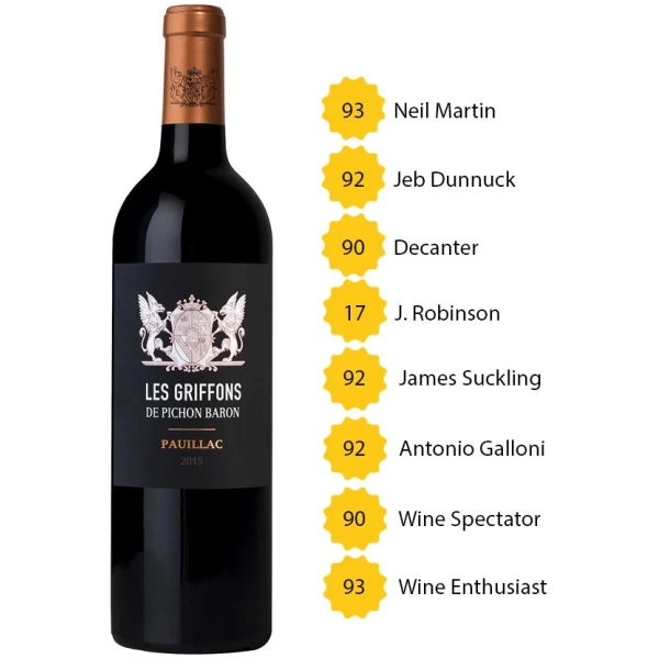 Les Griffons de Pichon Baron 2015 ist ein beeindruckender Pauillac-Wein, der von James Suckling hoch bewertet wurde. Dieser Wein besticht durch reiche Aromen und Geschmacksrichtungen dunkler Beeren. Die Tannine sind gut ausbalanciert und heben das volle Potential der Früchte hervor. Der Wein zeichnet sich durch eine frische, lebendige Endnote aus. James Suckling vergab 92 Punkte und empfiehlt, diesen Wein ab dem Jahr 2020 zu probieren.