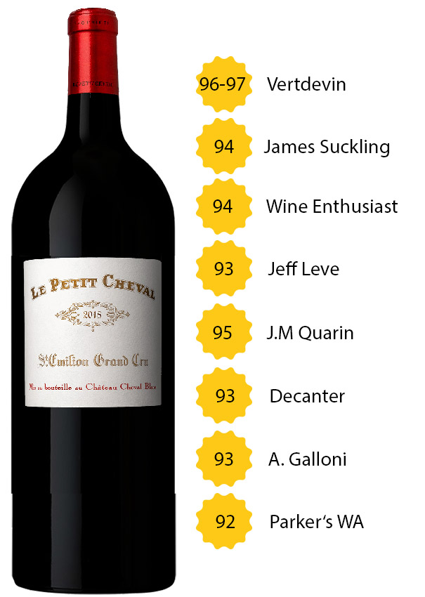 The Wine Enthusiast bewertete (05/2021) Le Petit Cheval 2018 wie folgt: „The second wine of Château Cheval Blanc, this is rich and structured in its own right. It offers powerful tannins as well as ripe, smoky fruitiness. Blackberry flavors vie with structured richness, always keeping a center of freshness. The wine will age well and should not be drunk before 2026“- 94 Punkte